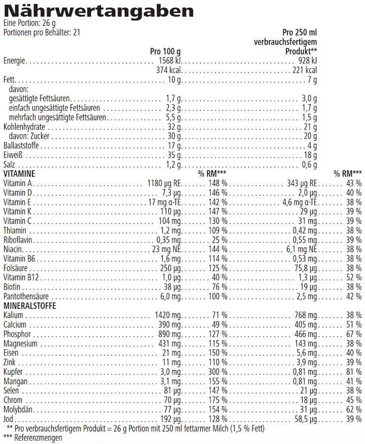 Nährwerte auf einen Blick (pro Portion, zubereitet mit 250 ml fettarmer Milch):